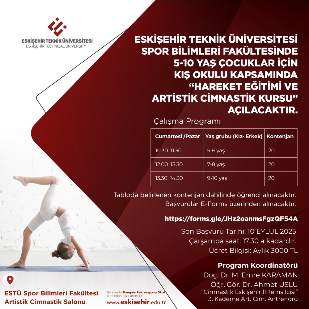 ESKİŞEHİR TEKNİK ÜNİVERSİTESİ SPOR BİLİMLERİ FAKÜLTESİNDE KIŞ OKULU KAPSAMINDA 5-10 YAŞ ÇOCUKLAR İÇİN “HAREKET EĞİTİMİ VE ARTİSTİK CİMNASTİK KURSU” AÇILACAKTIR.